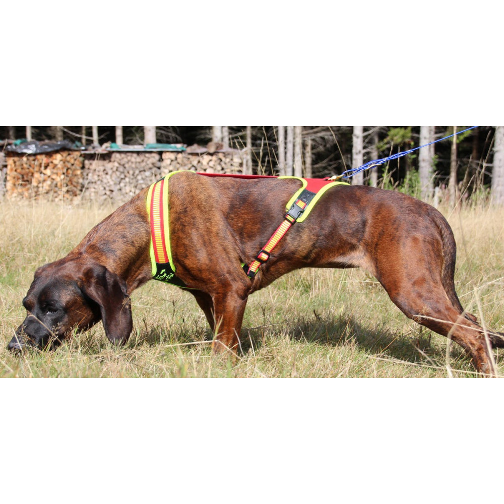 Popruh je pružný a elastický; pes nie je obmedzený v pohybe a môže voľne sledovať s nosom pri zemi.