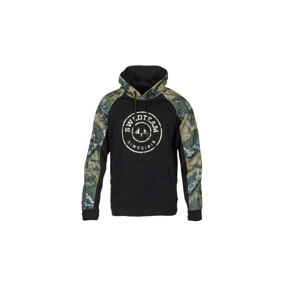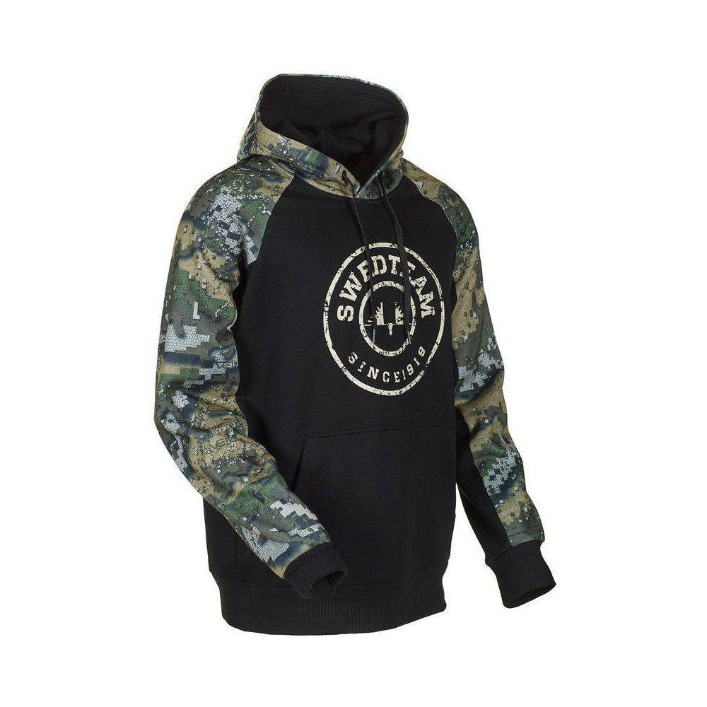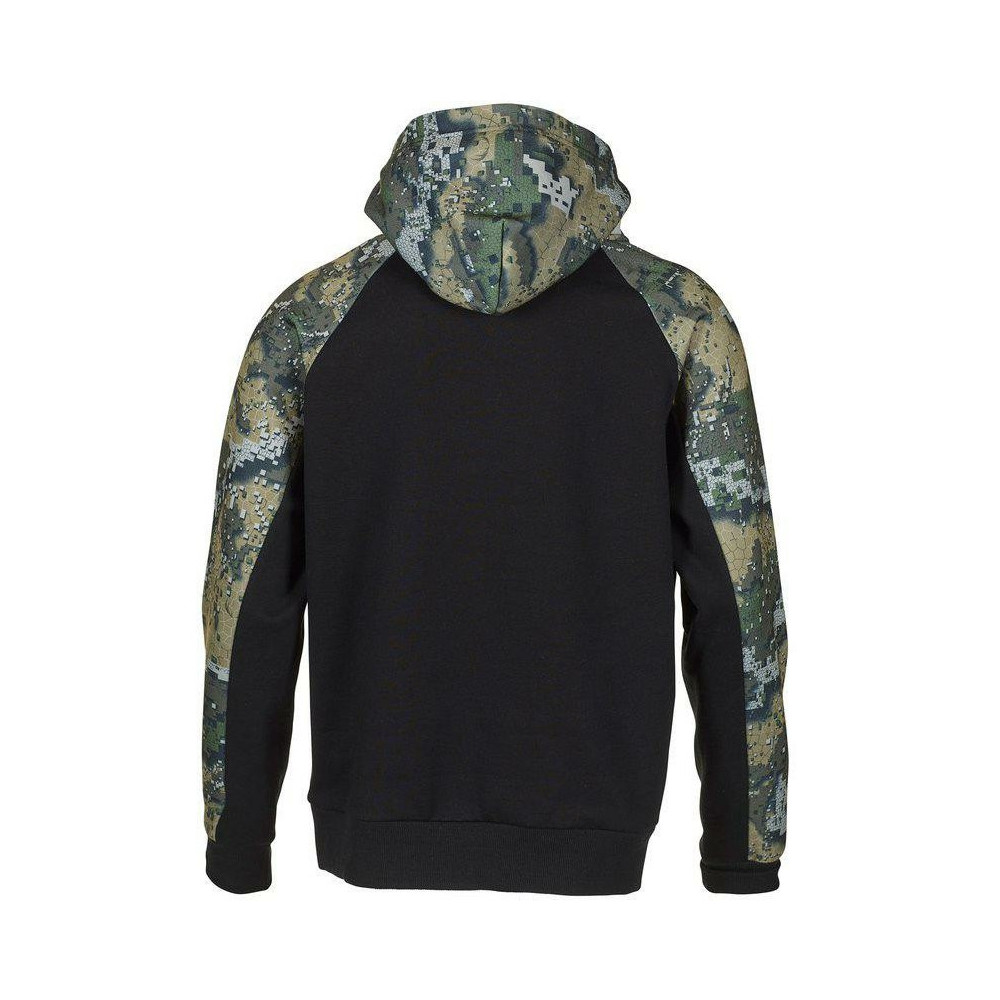 Čierna pohodlná mikina na bežné nosenie s predným prepojeným vreckom na ruky a kamuflážovým vzorom Desolve Veil® po bokoch rukávov.
